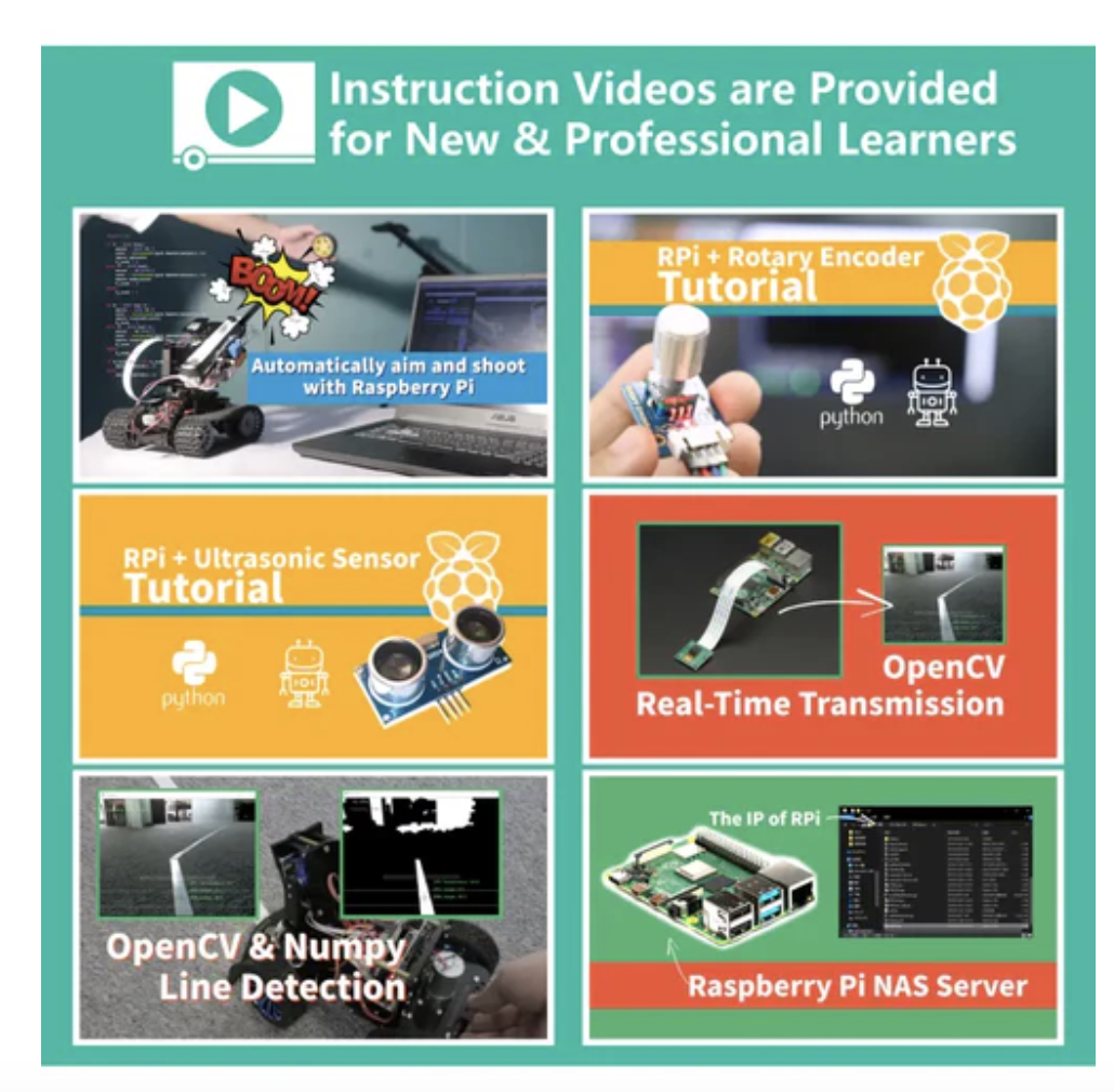 • Functions include obstacle avoidance, line following, tracking code, and more.