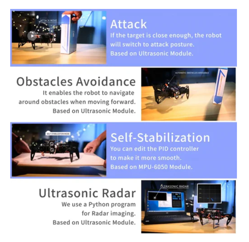 The Adeept Hexapod Spider Robot Kit (with Pixie) is an excellent open-source hexapod spider robot that anyone can use to build their own walking robot, even without any prior knowledge of robotics. It is designed to help beginners and more advanced robotics enthusiasts step into the exciting world of robotics.
