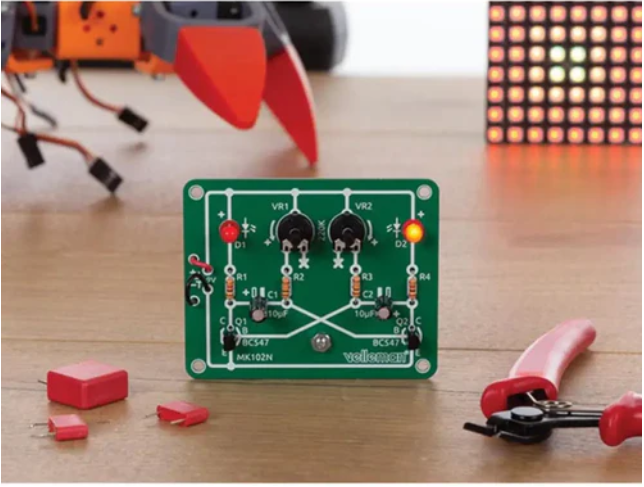 • After soldering the electronic components, just add a 9V battery (not included) and the two red LEDs will start blinking. You can also adjust the blinking frequency of each LED using two potentiometers. The kit can be used for a variety of purposes, including plastic model building and light effects.