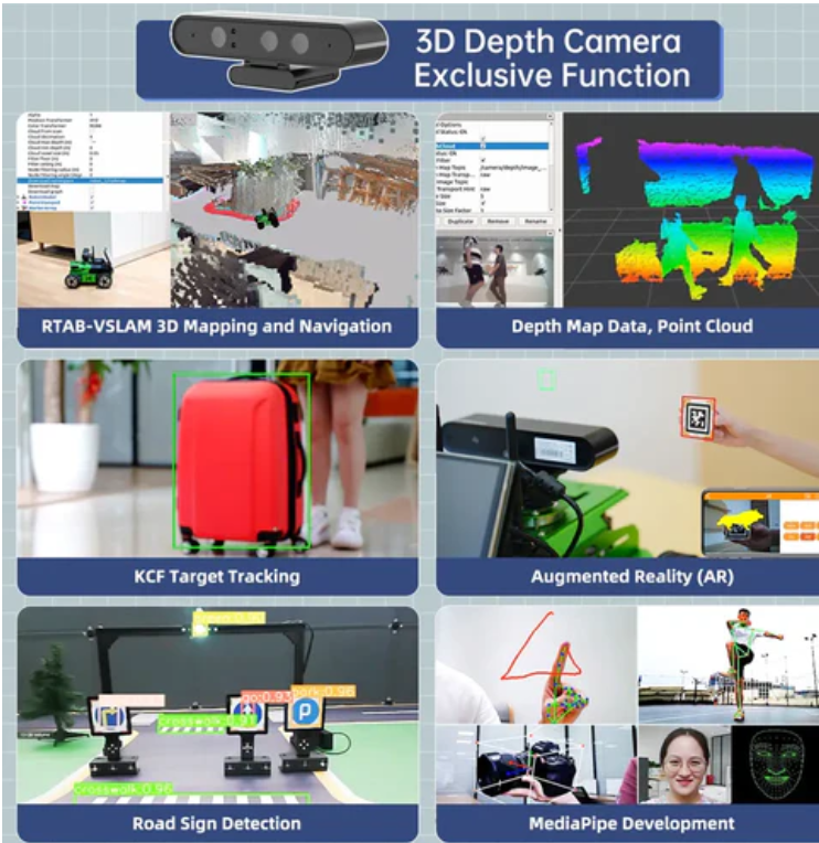 JetAcker is powered by NVIDIA Jetson Nano and supports ROS, deep learning, MediaPipe, YOLO, and TensorRT to perform advanced 3D vision tasks