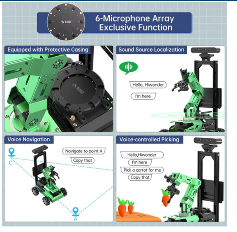 Supports far-field voice interaction with a 6-microphone array, enabling voice control for mapping and grasping