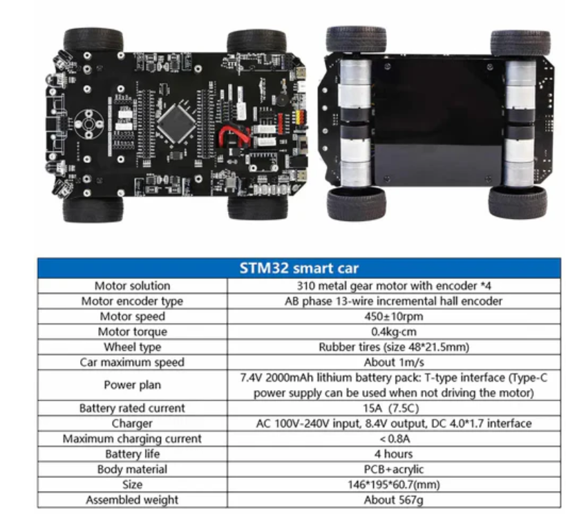 This development board is designed based on STM32 MCU and integrates various components and sensors. With STM32F103ZET67 as the core chip, it gathers multiple components such as buzzer, infrared sensor, photosensitive sensor, RGB searchlight, independent button, etc., combined with tires, motors, ultrasonic modules, etc., it can be assembled into a 4WD intelligent car. Through C language programming, it can achieve various functions such as autonomous obstacle avoidance, infrared tracking, remote control, etc. We have also designed rich interfaces (XH2.5, PH2.0, UART, SPI, etc.) on the STM32 board, providing developers with the possibility of custom extensions and feature enhancements, making it an ideal platform for learning embedded system development and robot cars.