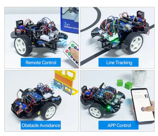 The SunFounder 3-in-1 Starter Kit is compatible with Arduino IDE and Scratch, and is suitable for beginners and experienced software engineers. With this kit, you can learn how to build and program a multifunctional smart car. It includes features such as line tracking, obstacle avoidance, remote control, etc.
