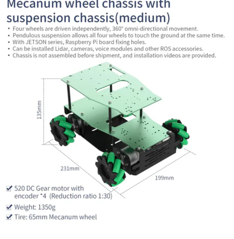 The robot chassis platform is made of high-strength aluminum alloy metal oxide spray paint material, ensuring its durability. It is equipped with 520 encoder speed measurement motors, providing high-precision coding. Each chassis kit has different motor ratios, making it easier to control the speed of the car and use the speed difference to control the direction of the robot's travel.