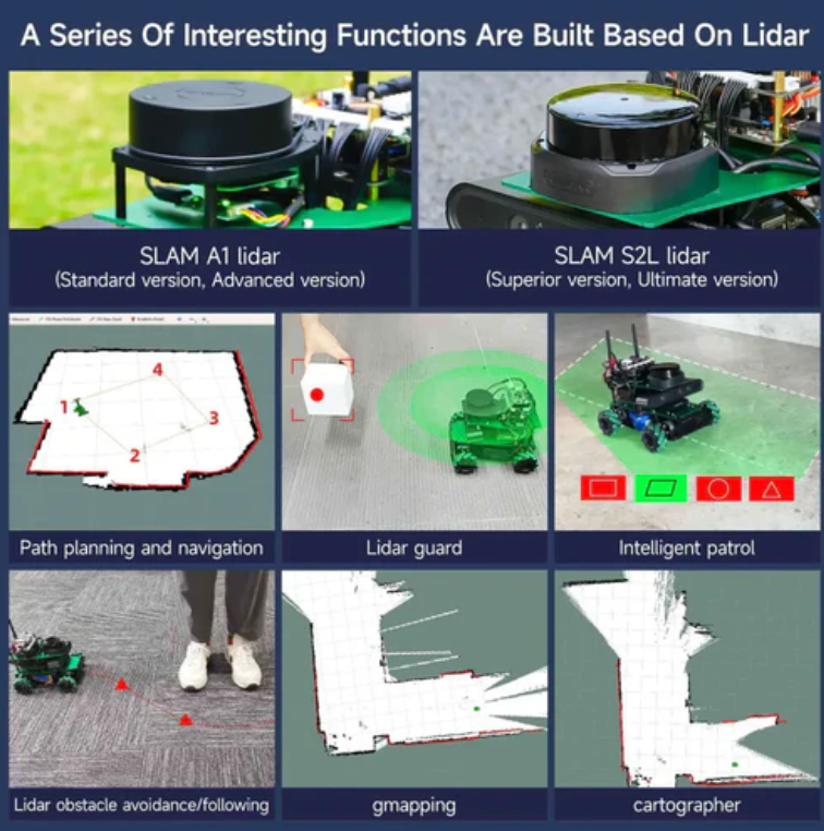 1. Excellent hardware configuration: aluminum alloy body, 360 ° omnidirectional Mecanum wheel, laser radar, high-quality depth camera, professionally designed expansion board, professional ROS robot, supporting more development, users can conduct secondary development learning on the basis of existing courses.