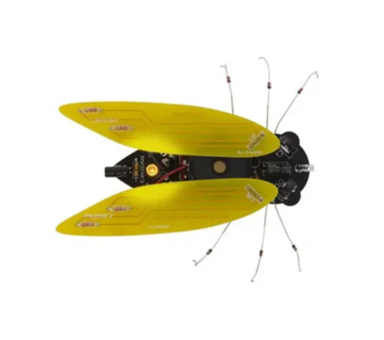 • The Electronic Semi-Soldering Kit allows you to create a semi-formed robot using only three PCBs. Its body is matte black and its wings are shiny yellow with gold traces. Using the included parts, you can add legs to a cicada, thus creating a robot that looks like a cicada.