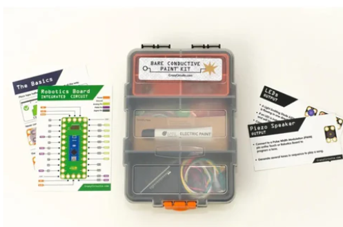 Crazy Circuits Kit with Bare Conductive Paint combines the power of Arduino with the conductive paint from Crazy Circuits. The included Invent Board enables users to turn the included conductive paint into interactive programming projects. Create your own programs or use one of the many online guides or tutorials.