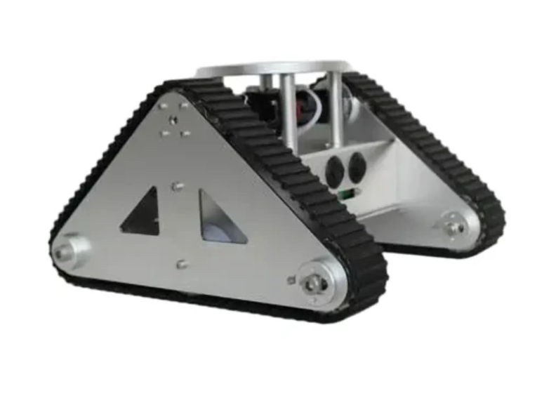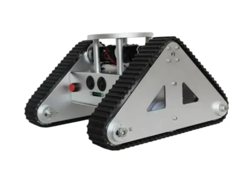 The aluminum chassis surface of this multifunctional three track tank robot kit has been anodized to a white color. The sturdy aluminum chassis contains tracked tank wheels, rubber tracks, IO extensions, microcontrollers, ultrasonic sensors, and DC motors with encoders. It has been specially designed with a circular plate at the top, which has some pre drilled holes for expansion, such as cameras or micro robotic arms.