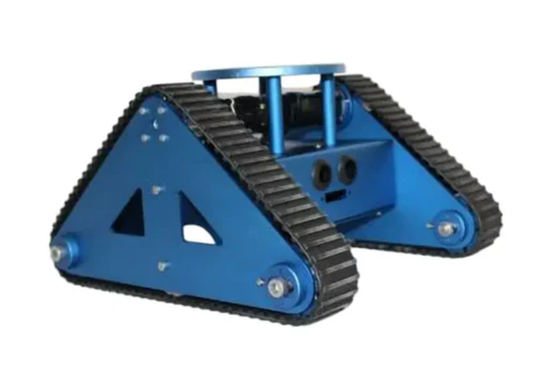 This kit has an aluminum chassis that has been anodized blue. The sturdy aluminum chassis includes tracked tank wheels, rubber tracks, microcontrollers, and DC motors. It has been specially designed with a circular plate at the top with some pre drilled holes for expansion, such as cameras or micro robotic arms.
