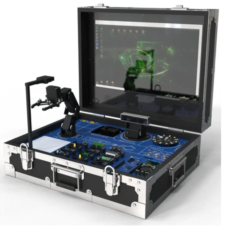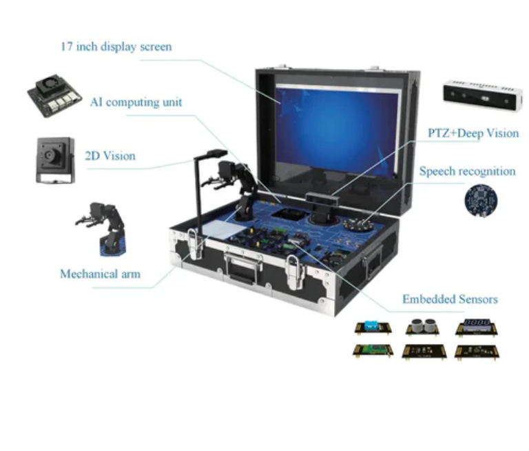 The AI experiment box is designed for AI related disciplines, integrating a variety of embedded application modules such as computer vision system, voice processing system, mechanical arm, gesture sensor, temperature and humidity sensor, air pressure sensor, etc. It provides a unified communication protocol and interface for AI related application development by building a edge computing terminal. The experimental box is based on the Linux operating system and uses Python for course resource development. It is suitable for teaching and practical implementation of more than 8 artificial intelligence related courses.