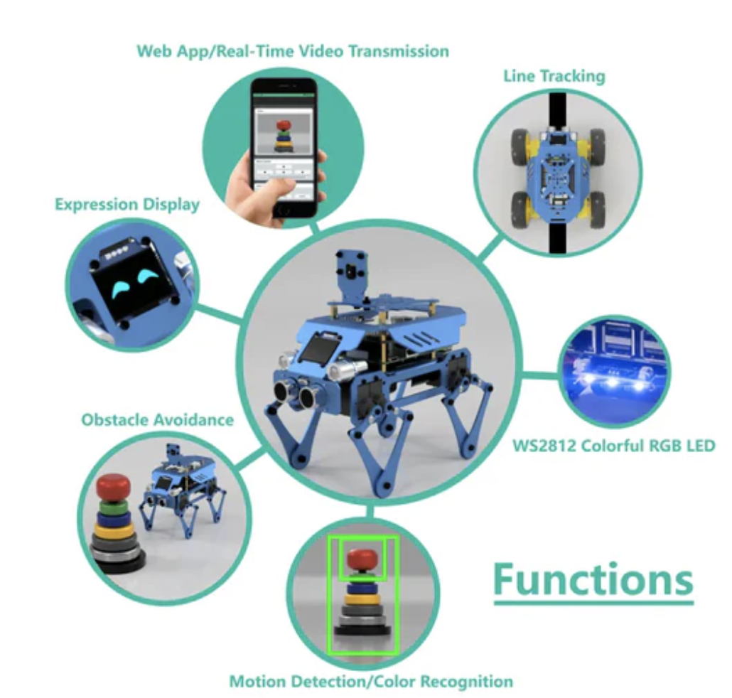 • Functions include obstacle avoidance, line following, tracking code, and more.