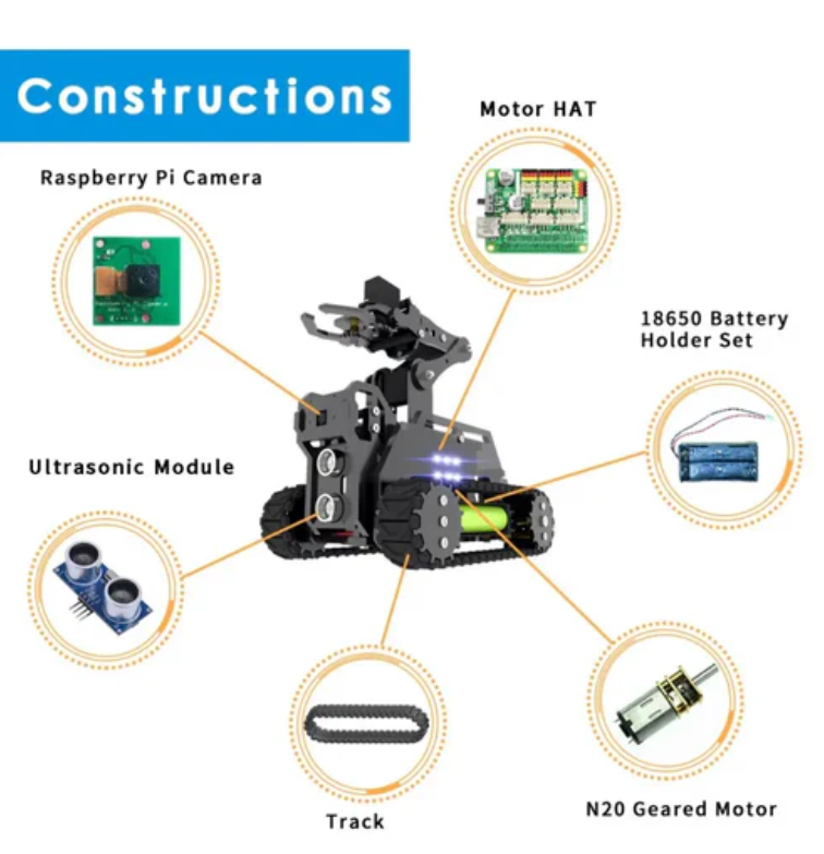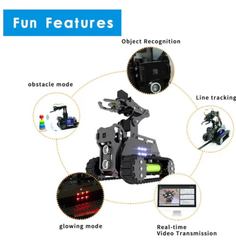 Adeept RaspTank WiFi Intelligent Robot Tank Kit is suitable for Raspberry Pi and is a tracked mobile robot platform based on Raspberry Pi. It is equipped with a 4-degree-of-freedom robotic arm that can grasp small objects. RaspTank is designed for beginners and professionals to learn AI, robotics, programming, and electronics. A 73 page PDF manual with illustrations teaches you how to gradually assemble a Raspberry Pi robot; Provide easy to understand Python code with beautiful and practical GUI programs (compatible with Windows and Linux operating systems).