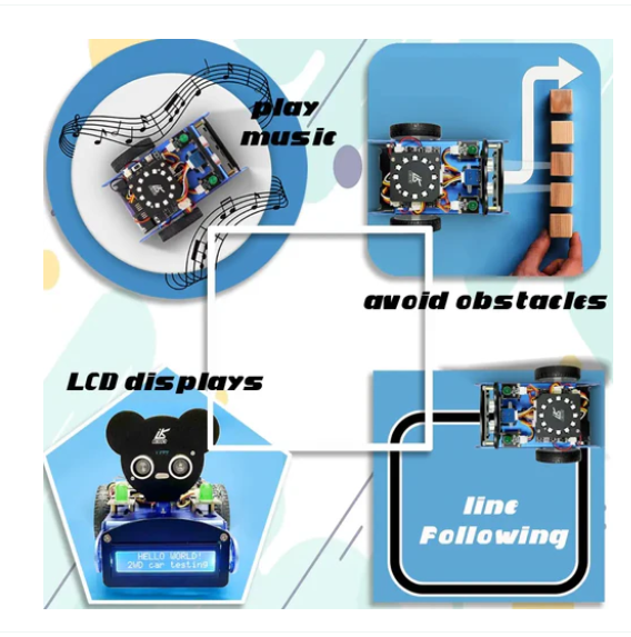 • Users can explore various features, including smartphone controlled robots compatible with Android devices and infrared remote-controlled robots. This kit is equipped with features such as obstacle avoidance, line tracking, LCD display screen, and light show. It comes with detailed tutorials, including step-by-step instructions, circuit schematics, and source code, to guide users through the assembly and programming process.