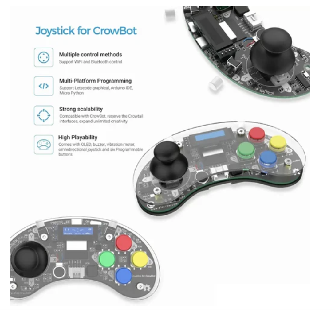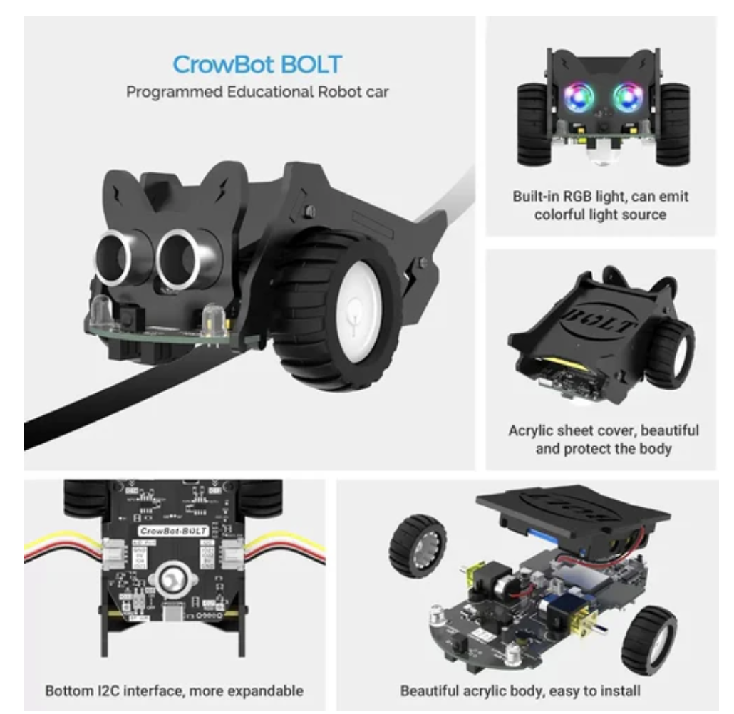 CrowBot BOLT - Open Source Programmable Smart Robot Car with Joystick is an innovative open source programmable smart car with ESP32 chip. Equipped with various sensors such as optical sensors, ultrasonic sensors, line tracking sensors, and Wifi and Bluetooth functions, it is a multi-functional tool compatible with various programming environments such as Letscode, Micropython, Arduino, etc.