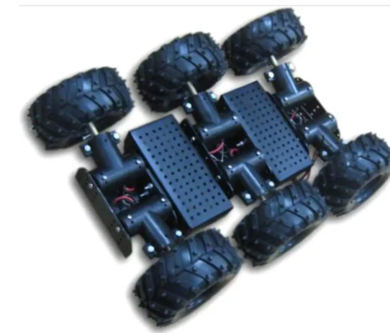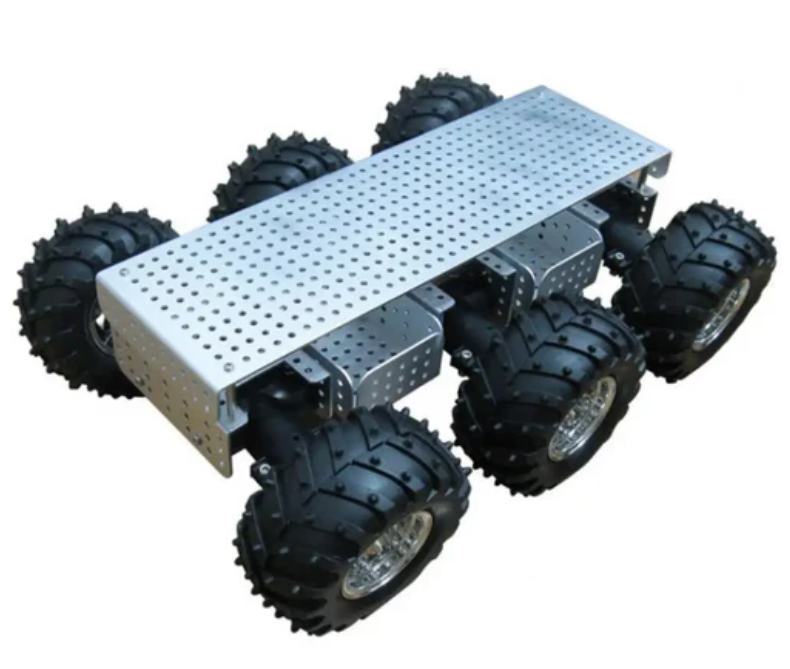 The Dagu "Wild Thumper" 6WD all terrain chassis (aluminum, 34:1) is made of 2mm thick anodized aluminum plate and comes with stainless steel and nickel plated brass fittings. It is equipped with 6 powerful steel gear motors, studded tractor tires, and a "super twist" suspension system that allows all wheels to land on the ground. This chassis allows your robot to go almost anywhere. The research on outdoor search and rescue robots is not only an important topic for universities, but also leads the development direction of military applications. Each unit is pre assembled in a color printing box. Simply use the provided hex wrench to install the wheels. Attached is a simple printed manual.