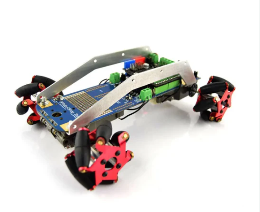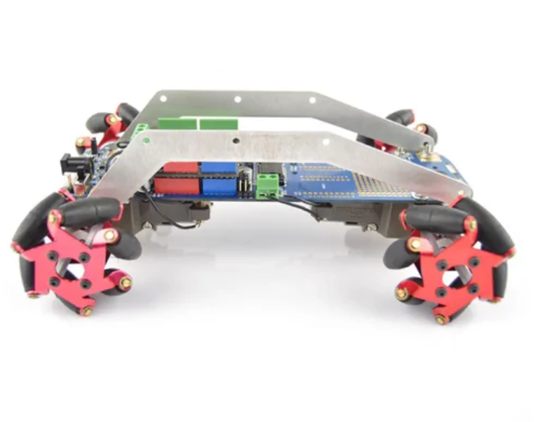 DFRobotShop Mecanum Rover 2.0- Arduino compatible robot is a multifunctional mobile robot based on the popular Arduino Uno microcontroller. Rover uses two Tamiya dual motor transmissions, each with its own pair of encoders, and a dual motor controller shield * * to independently control the four Mecanum wheels. The DFRobotShop Rover PCB integrates the standard Arduino Uno (surface mount ATMega328), L293B motor driver (connected to pins 5 to 8), voltage regulator, and prototype design area, and is also part of the robot's mechanical structure. The onboard voltage regulator allows the use of voltages as low as 3.7V to~9V * to power the entire circuit board.