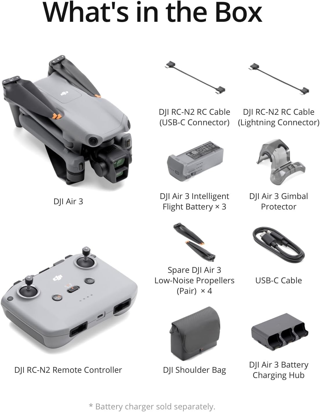 DJI Air 3 Fly More Combo with RC-N2 Remote Controller, Drone with Camera 4K, Dual Main Camera, 3 Batteries for Extended Flight Time, 48MP Photos, Adult Camera Drone, FAA Remote ID Compliant