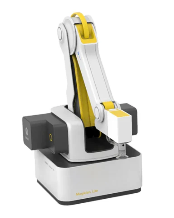Magician Lite is compact in size, weighing only 2.4 kilograms, making it easy to carry and build application scenarios. Its repeated positioning accuracy is 0.2 millimeters, effective payload is 0.25 kilograms, and radius range is 340 millimeters. It supports soft grippers, suction cups, pen grippers, and other replaceable end tools. This robot has collision detection function, making it safer for children to use around.
