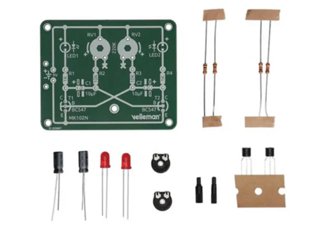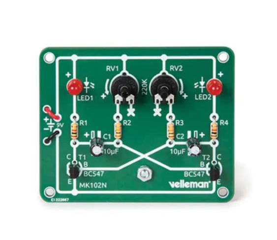 • After soldering the electronic components, just add a 9V battery (not included) and the two red LEDs will start blinking. You can also adjust the blinking frequency of each LED using two potentiometers. The kit can be used for a variety of purposes, including plastic model building and light effects.