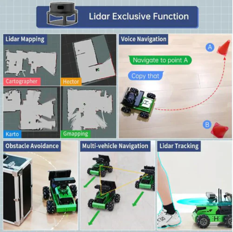JetAuto is equipped with LiDAR, which can achieve SLAM mapping and navigation, supporting path planning, fixed-point navigation, and dynamic obstacle avoidance.