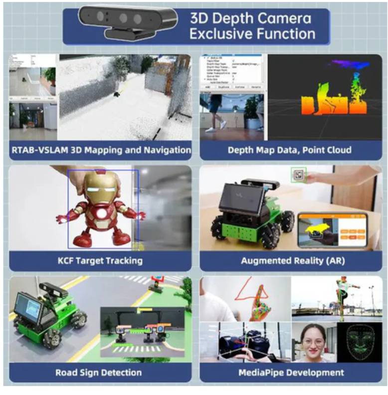 JetAuto is equipped with a 3D depth camera, which supports 3D visual mapping and navigation, and can obtain 3D point cloud images. Through deep learning, more AI visual interactive gameplay can be achieved.