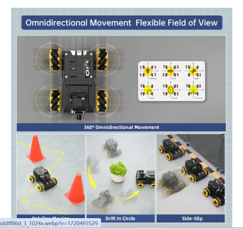 The TurboPi is equipped with four universal Mecanum wheels, which can rotate 360 °. It has multiple motion modes (forward, horizontal, diagonal, and rotary) and excellent performance, allowing it to challenge various complex routes.