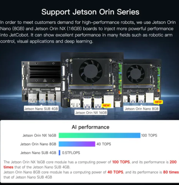 JetCobot uses NVIDIA series development boards as the main controller, with powerful computing power and AI processing capabilities, which can efficiently handle complex visual and control algorithms, ensuring real-time response and efficient execution.