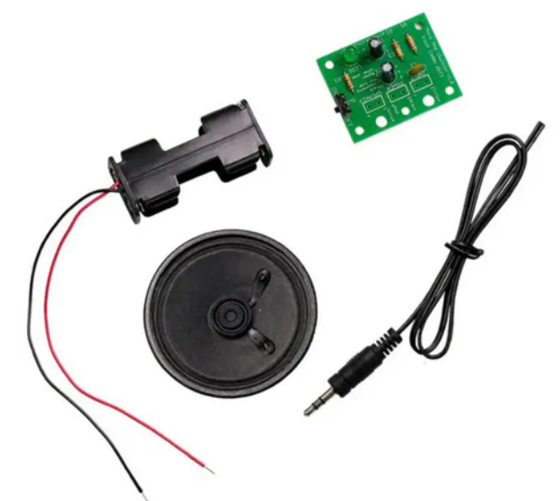 • The kit comes with a pre-assembled jack cable, 8Ω 66mm speaker, and AA battery pack that can operate from 2.5 to 5.5V (6V absolute maximum). For a complete parts list, see the "In the Box" section below.