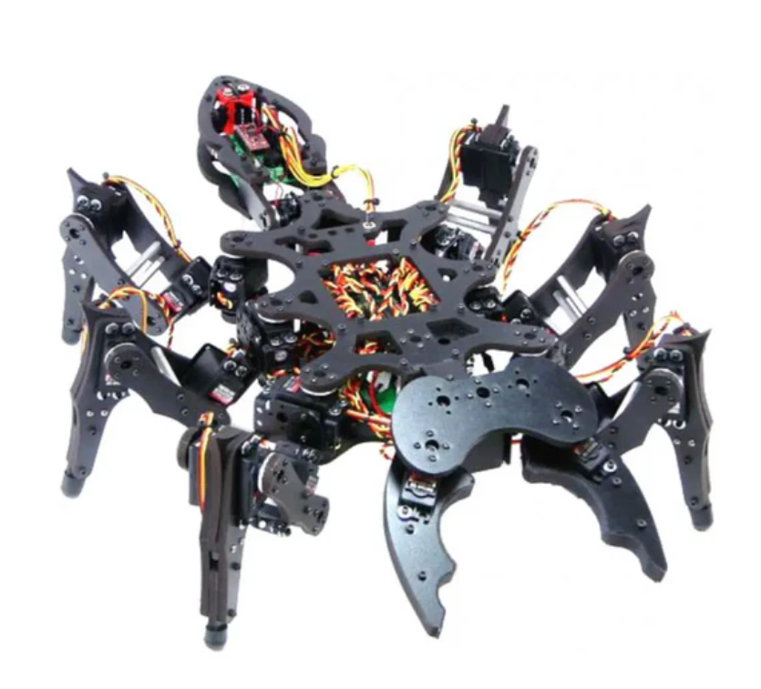 The Lynxmotion A-Pod Hexapod Robot Kit (Hardware Only) is inspired by insects. The angled legs offer an additional range of motion. The three-degree-of-freedom (DOF) leg design means that the robot can walk in any direction. The robot is designed to use 18 HS-645 servos for the legs and an additional 7 servos for the head and tail. It's truly amazing to see it in action.