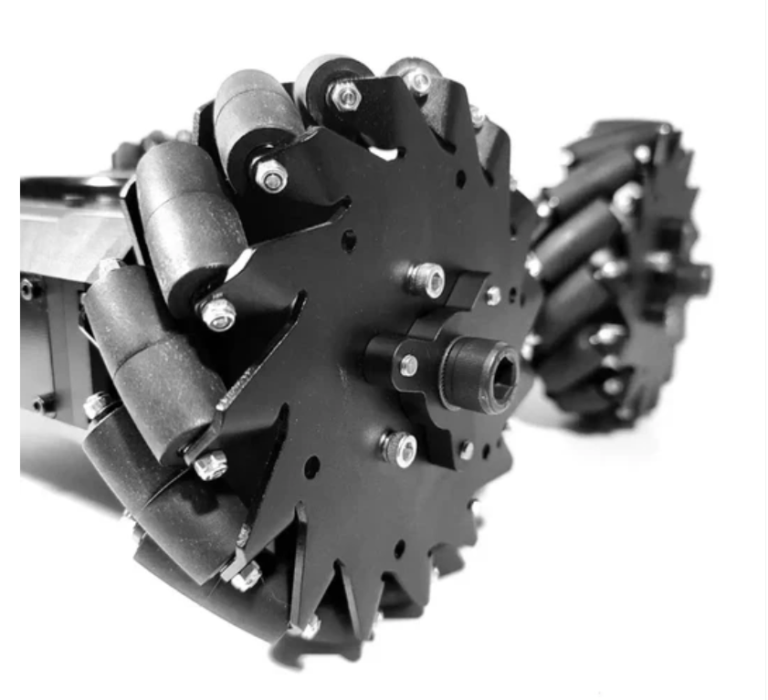 This variant includes a complete set of four Mecanum wheels with a diameter of 152 millimeters (two on the left and two on the right), and users can purchase other electronic devices separately. The Mecanum wheel provides unparalleled motion on a flat surface, allowing not only the full range of motion provided by 4WD, but also left-right movement and more. These Mecanum wheels are designed for flat surfaces.