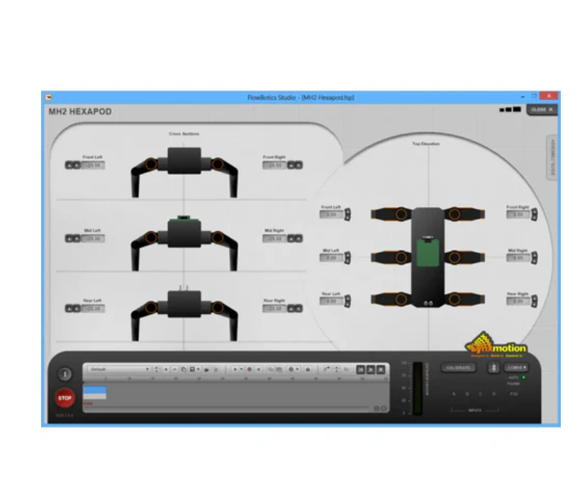 The Lynx Mini Hex hexapod robot kit MH2F (FlowBotics Studio) is a multifunctional 12DoF hexapod walking robot. This kit includes the complete version of FlowBotics Studio, including SSC-32, serial to Bluetooth board, and Bluetooth module, which can be remotely controlled from a computer. This method transfers advanced computing to computers. FlowBotics Studio includes an MH2 demonstration project with pre written walking algorithms. The hexapod robot is designed around simple mechanical legs, with all metal brackets. This leg design minimizes the number of parts required to make two degrees of freedom (DOF) legs, allowing the robot to operate like a tank. Supports forward, reverse, and stationary turning. The robot's legs use standard sized Hitec servers. The combination kit includes everything needed to make a functional robot, except for the battery and optional PS2 controller. Mechanical structure hexapod
