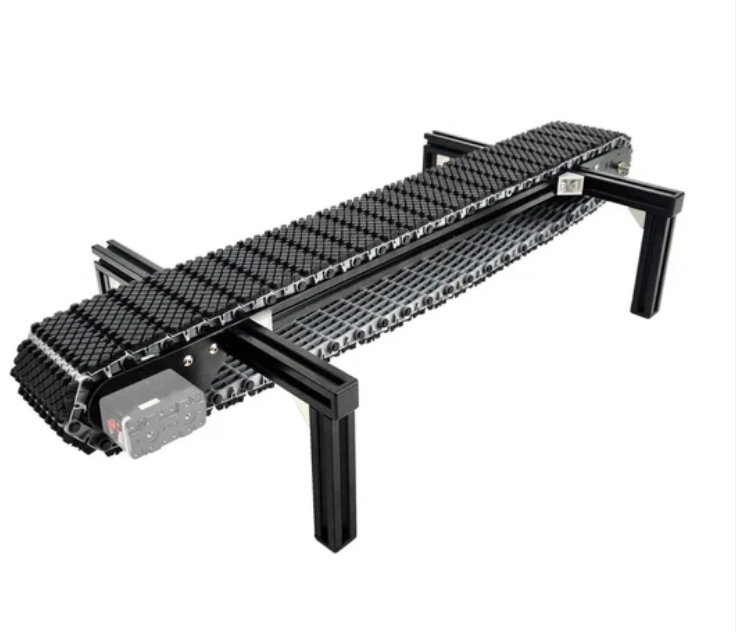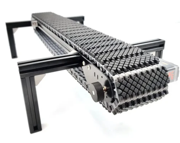 The frame of the conveyor is made of aluminum extruded parts and composite G10 board. The friction top (rubber pattern) modular track segment helps ensure that the product stays on the conveyor, while the drive and idler sprockets always maintain track alignment.