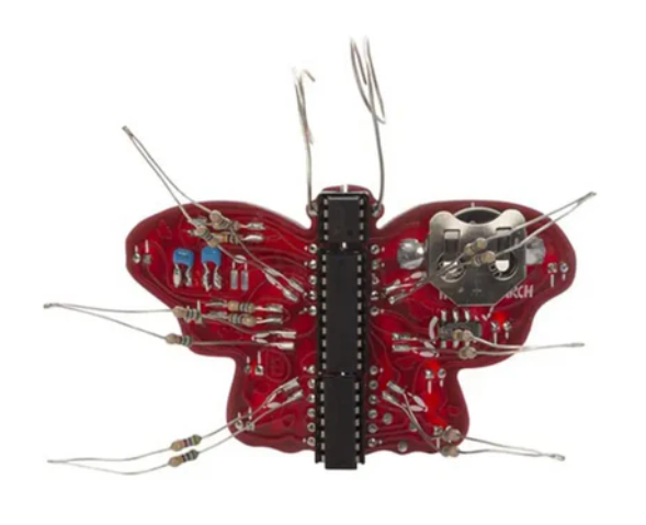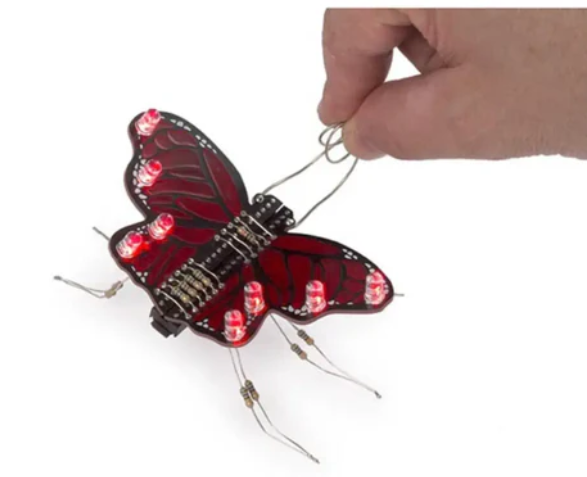 • The Monarch Butterfly Robot Soldering Kit flashes red LEDs when the antennae touch, mimicking the movement of wings.