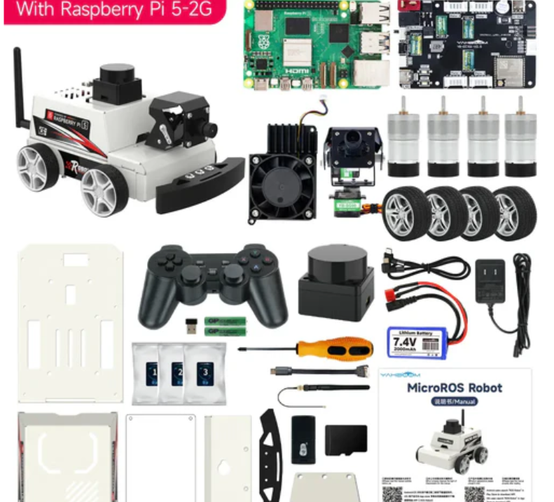 You will receive a programmable robot kit with a metal chassis structure and most components pre installed. It includes an expansion board with onboard ESP co processing, a six axis IMU, 310 encoder deceleration motors, a 7.4V rechargeable battery, Raspberry Pi 5 (depending on version), Pi 5 active heat sink, LiDAR, and 2DOF camera. Combining high-performance hardware with solid electronic course content, including Yahboom's original practical and theoretical courses, technical guidance