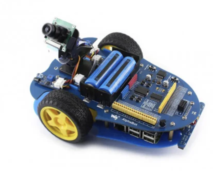 The AlphaBot Chassis Kit for Raspberry Pi (Raspberry Pi and Camera) comes with a Raspberry Pi 3 Model B, AlphaBot robotic platform (line following, obstacle avoidance, speed measurement, IR control), and a camera (with servos and 2 DOF gimbal).