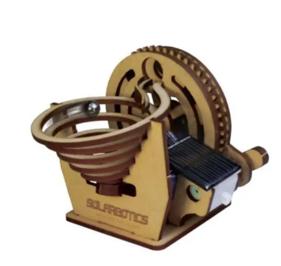 The Solarengine circuit in the Solarbotics solar pinball machine stores the light emitted by the solar cells and releases it in occasional pulses to drive the mechanical device. Under sunlight, the motor pulses every few seconds and throws a ball every half minute. Under indoor lighting, the motor pulse will decrease to every few minutes (please be patient). But you can always use the hand crank to manually push the pinball wheel. This kit requires basic soldering tools (soldering iron, solder), Phillips screwdriver # 1, and a small amount of white glue.