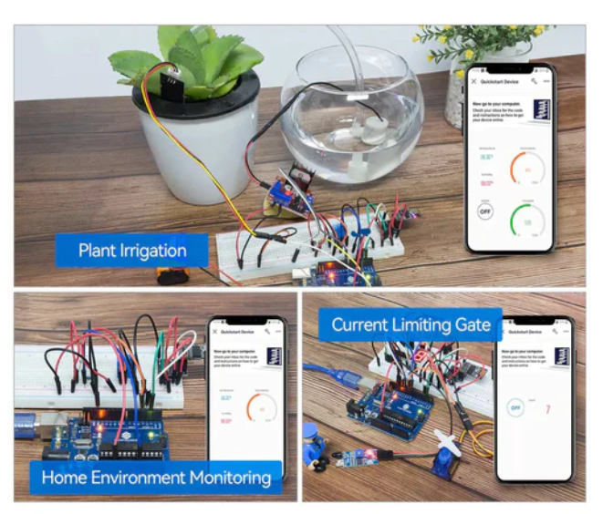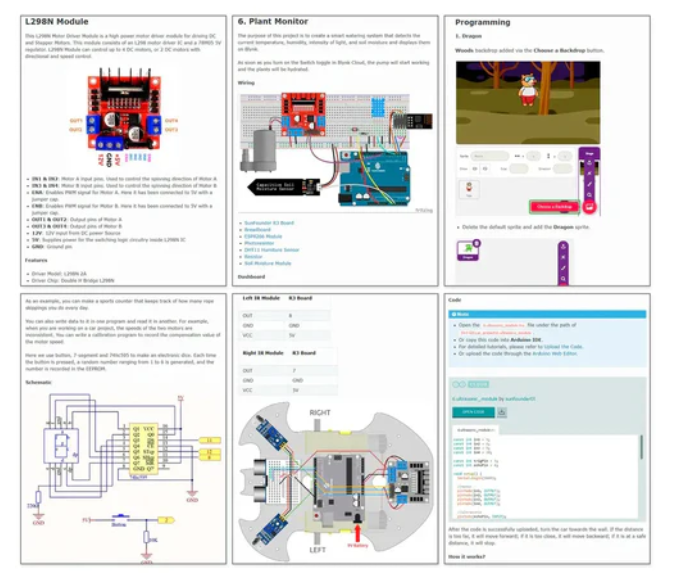 You can learn how to build IoT projects such as plant irrigation, door and window detection, etc. using ESP8266 and Blynk. The online tutorial contains a total of 87 projects. 39 of them are Arduino learning projects, 11 automotive projects, 8 IoT projects, and 29 Scratch projects.