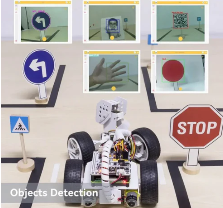 The installed camera module, ultrasonic module, and line inspection module can respectively achieve functions such as color detection, face detection, automatic obstacle avoidance, and automatic line inspection.