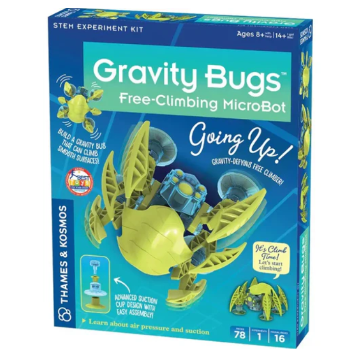 Thames&Kosmos Gravity Bug Vertical Walking Robot provides the construction of a powerful robot bug that can overcome gravity, easily climb up, down, and crawl around windows! This mobile quadruped machine uses a clever suction cup system to walk on smooth vertical surfaces, such as windows and smooth panels.