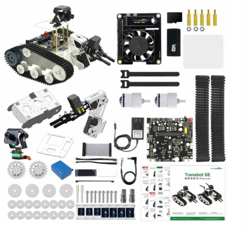 Transbot SE ROS robot, Python programming, Raspberry Pi high-definition camera (without motherboard) is a tracked robot vehicle developed based on Robot Operating System (ROS). The entire body of the robot is made of aluminum alloy, which is sturdy and durable. It is equipped with a 3-degree-of-freedom robotic arm and a 2-degree-of-freedom camera PTZ, as well as 520 encoder motors and a large capacity battery. This robot is compatible with Jetson Nano B01 and Raspberry Pi 5.