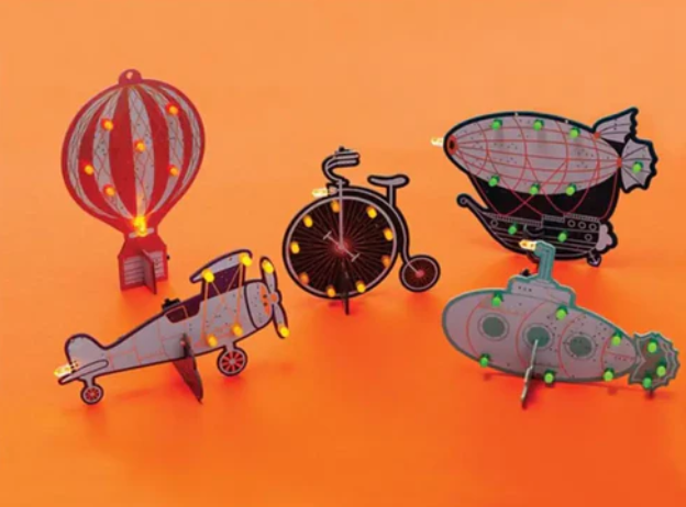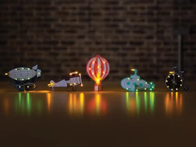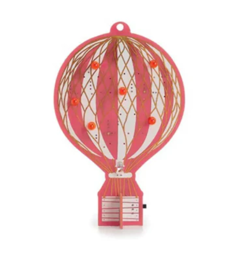 Once you are done, the kit's LEDs will light up and you will have a cool little gadget. The kit is shaped like a Jules Verne-style hot air balloon and can be hung using the small mounting holes on the top, or it can stand on its own.