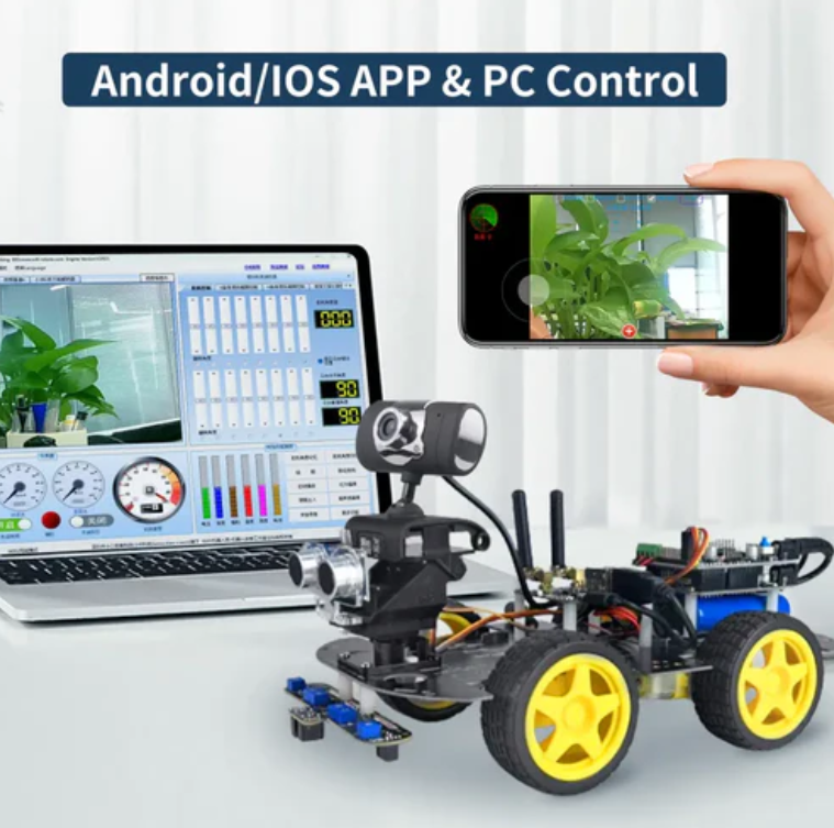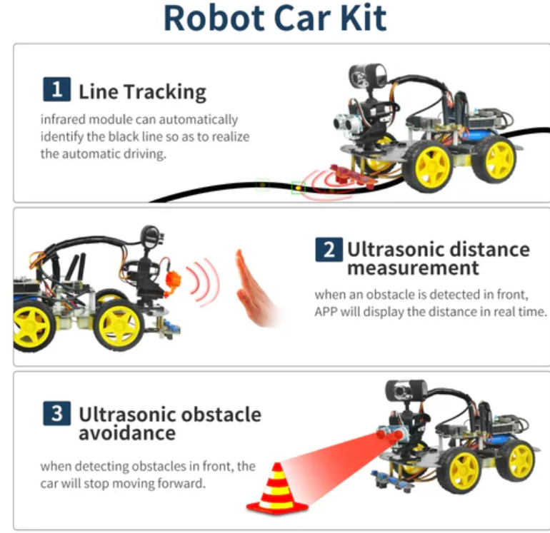 The robot car kit includes various modular components that can achieve ultrasonic obstacle avoidance, ultrasonic ranging, infrared recognition of black line automatic forward, real-time video of robot viewpoint, WiFi control, and Bluetooth control.