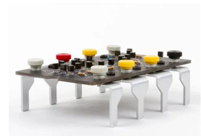 It includes the circuit board, resistors, transistors, and capacitors that make up the circuit, and printed instructions for composition. The kit also consists of an "IC standoff" standoff and 8 color-coded op-amp screw terminals.