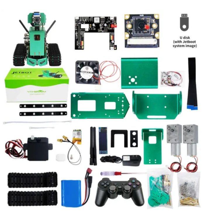 • Yahboom Jetbot Standard Edition AI robot with high-definition camera, suitable for Jetson Nano 4GB (without Jetson Nano board) is a multifunctional AI intelligent robot car based on Jetson Nano 4GB (A02/B01/SUB), which can quickly respond to various visual games. The car is made of green aluminum alloy, coupled with a unique mechanical structure, making its appearance unique compared to other cars. It is equipped with a 3-degree-of-freedom lifting platform and an 8-megapixel high-definition camera, which can view the surrounding environment in real time. It can also be used for automatic obstacle avoidance, object tracking, color recognition/tracking, detecting desktop edges to prevent falls, and more. You can also train various runway models and use Jetbot to complete autonomous driving functions. Programmable RGB light strips are also designed on both sides to provide bright and colorful lighting in dark environments. Users can remotely control it through an application or controller, and we will provide a large number of reference tutorials for users.