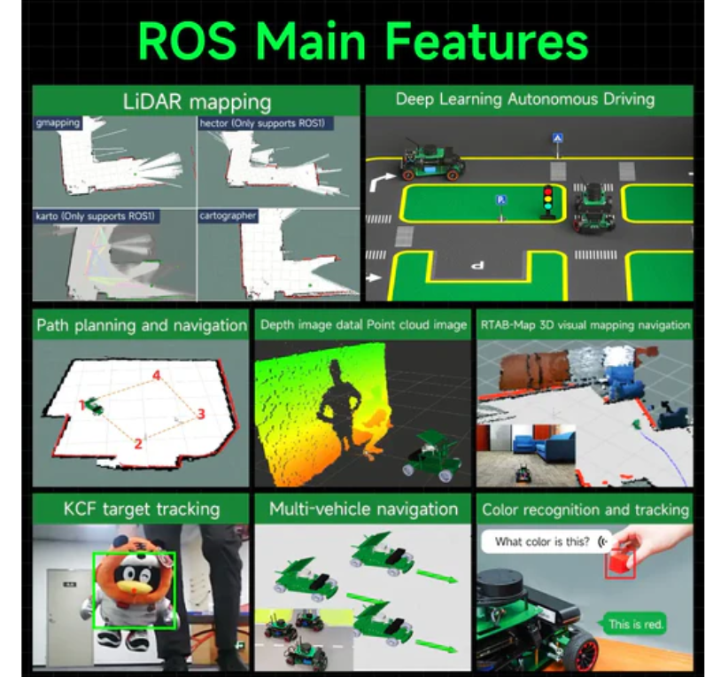 3. Based on the robot operating system, ROSMASTER R2 is equipped with high-performance hardware configurations such as LiDAR, depth camera, and voice interaction module, which can realize applications such as robot motion control, remote control communication, mapping and navigation, obstacle avoidance, autonomous driving, human feature action recognition, and voice interaction control.